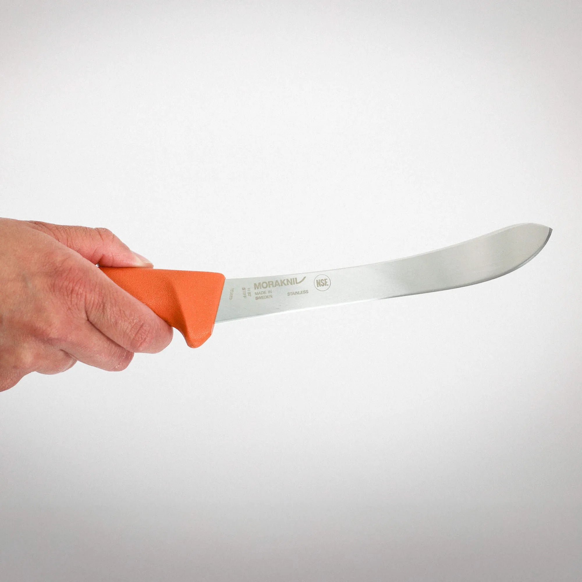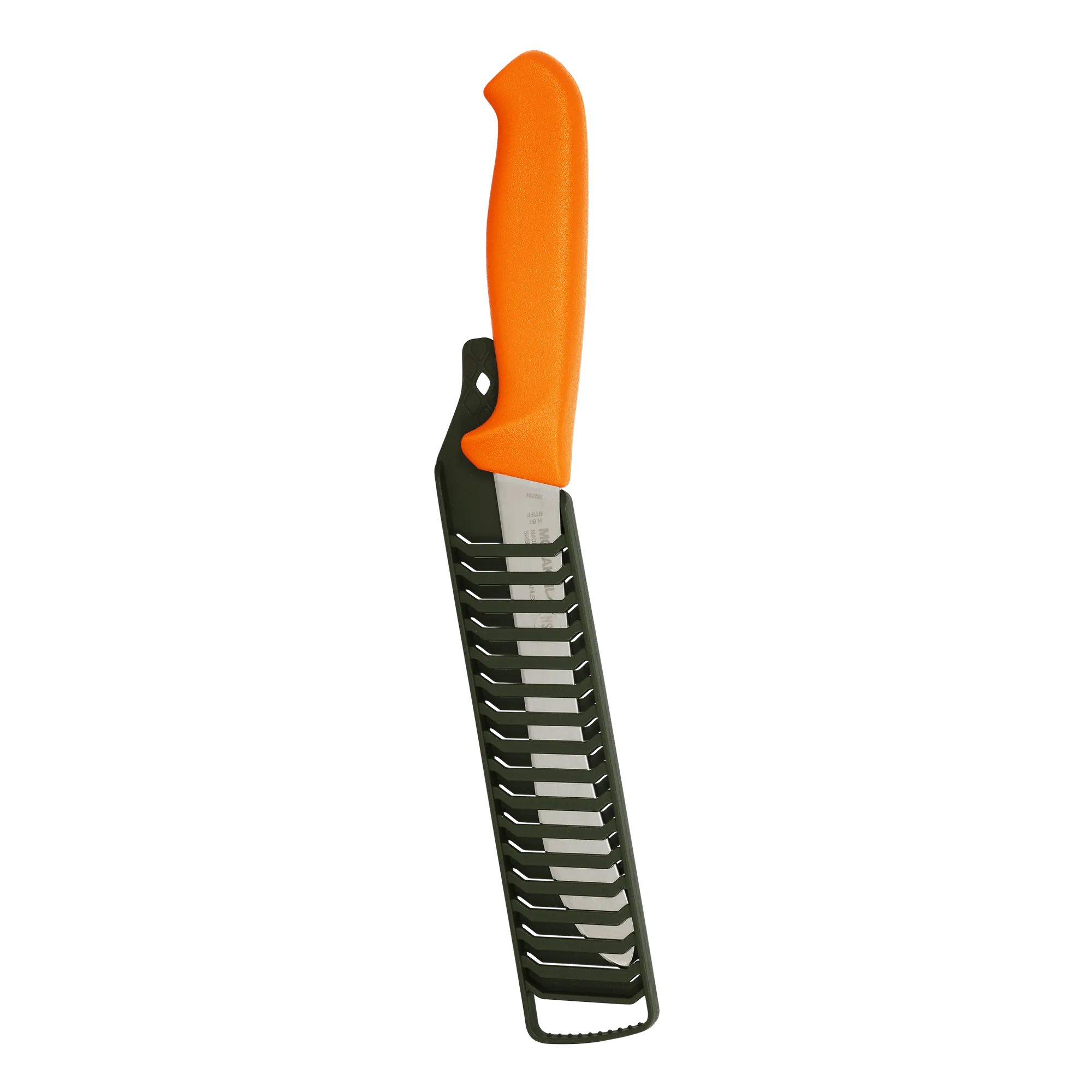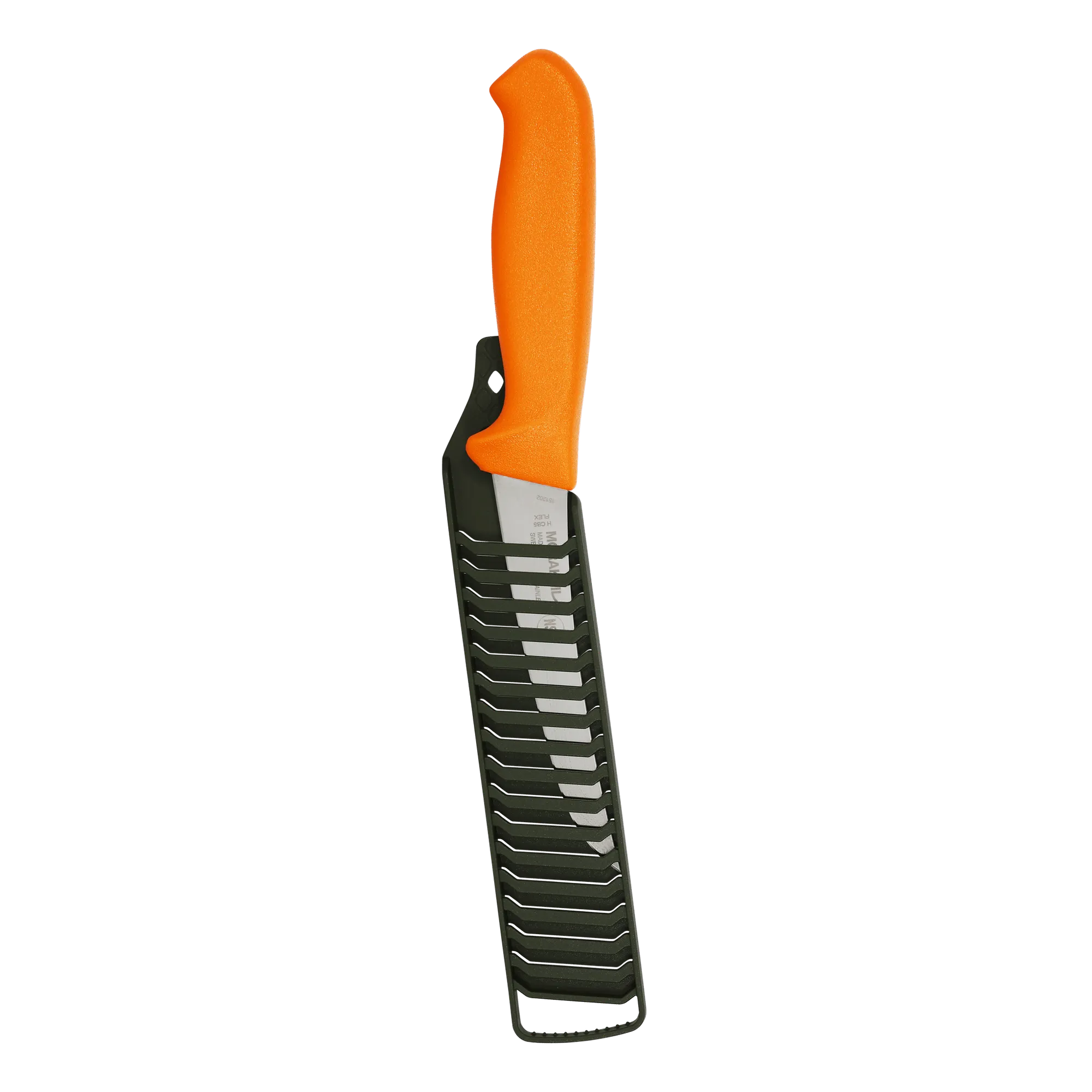 Moraknivs jaktknivar har formgjutna skaft i plast som är ergonomiskt utformade för att ligga bekvämt i handen. De har fingerskydd för säker hantering och friktionsyta som ger ett säkert grepp även i blöta förhållanden.