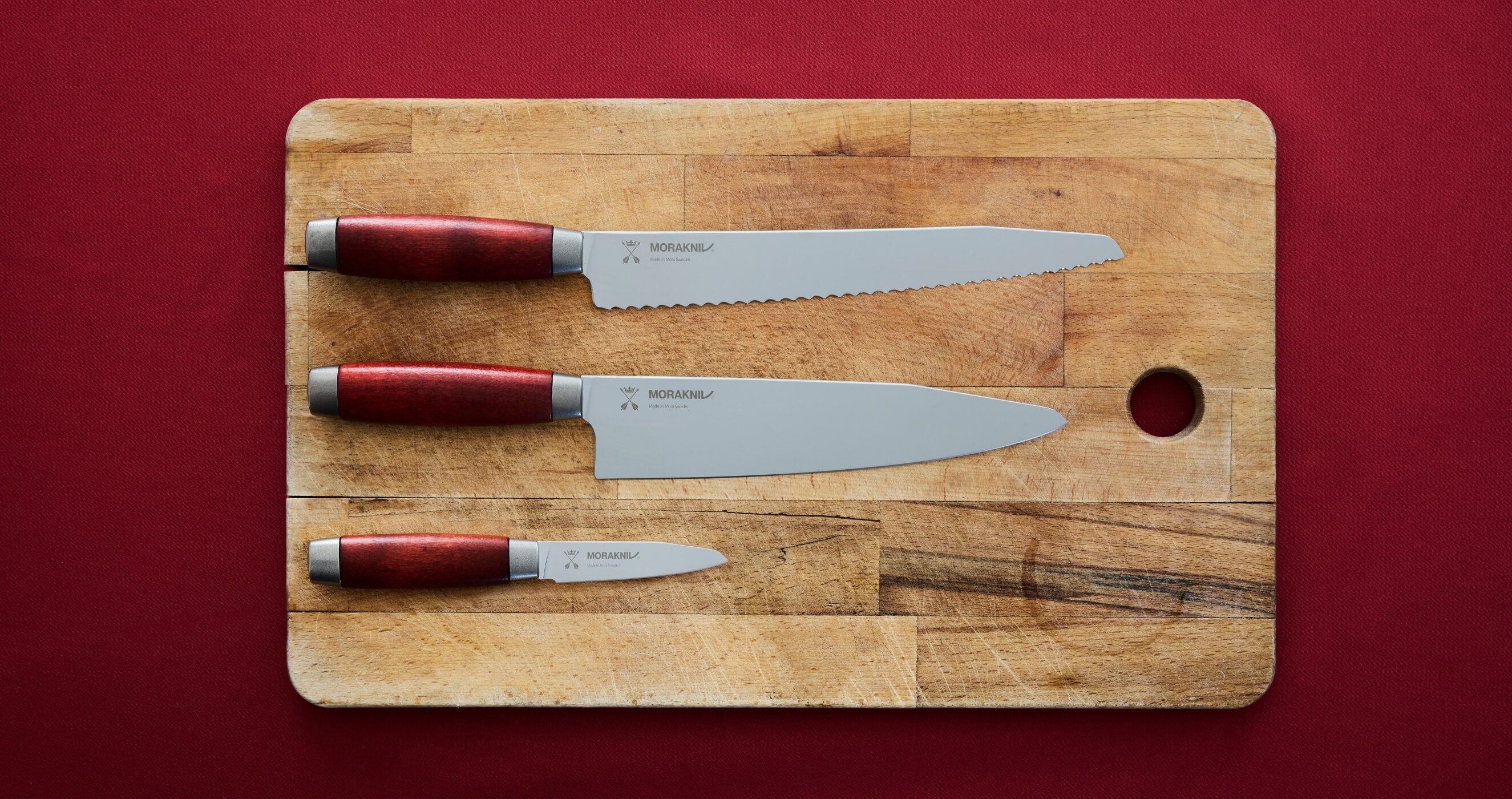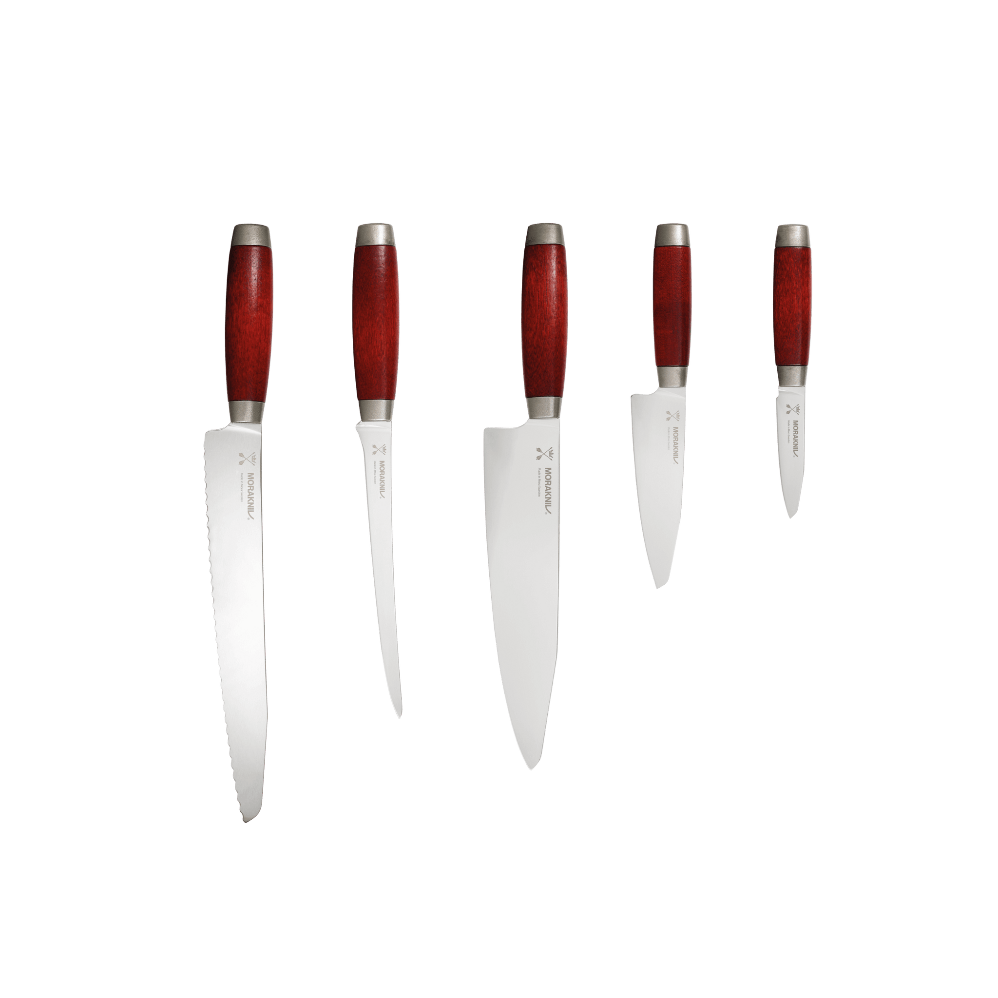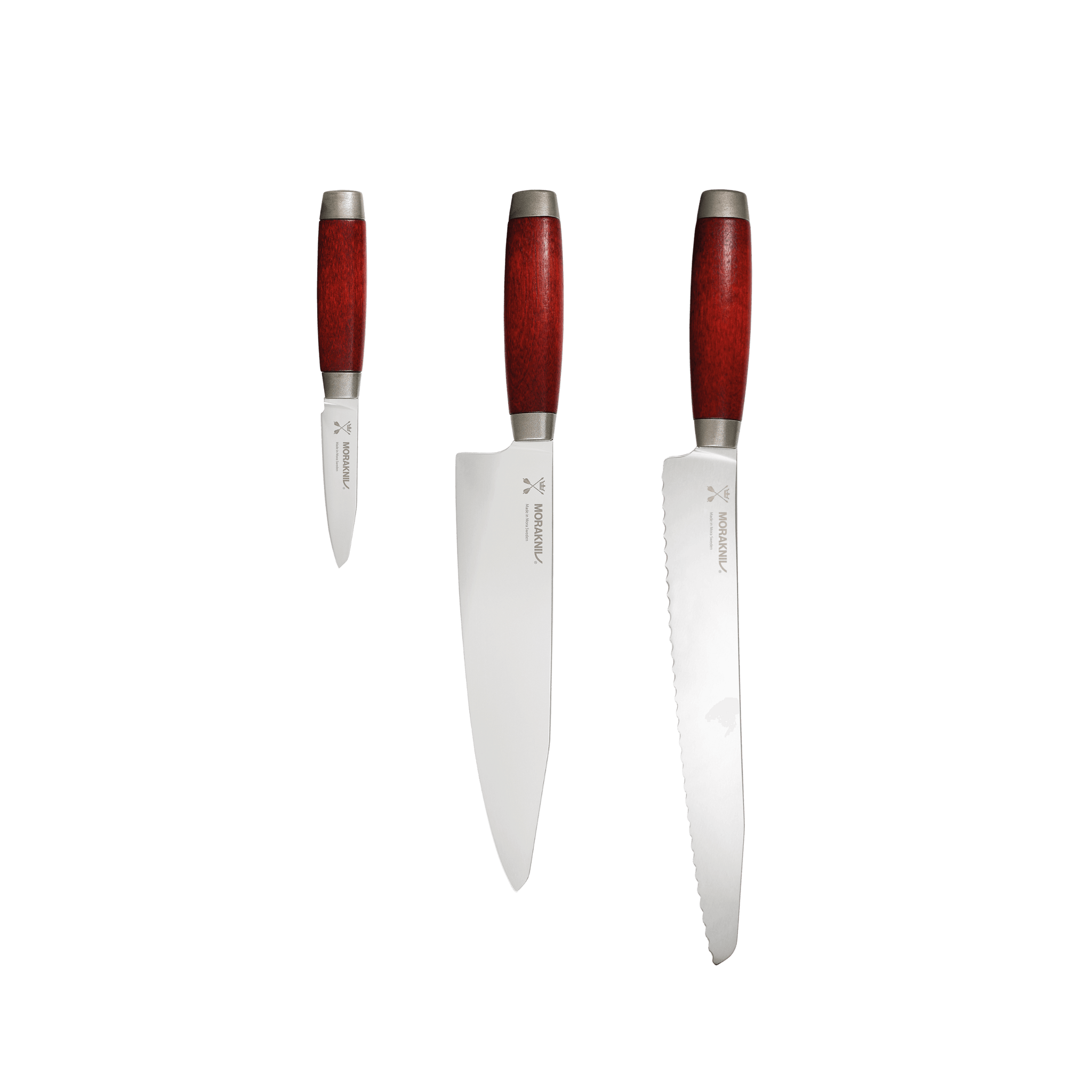 Kökskniven är ett av kökets allra viktigaste verktyg. Med rätt kökskniv i handen går matlagningen både snabbare och roligare. Ett knivset från Morakniv innehåller flera olika knivar som alla har sin specifika funktion – från att skära grönsaker med precision till att skiva bröd eller filéa fisk.Knivarna är tillverkade av svenskt rostfritt stål och har handtag i rödbetsat trä, vilket både ger ett bra grepp och ett klassiskt utseende som passar in i vilket kök som helst.