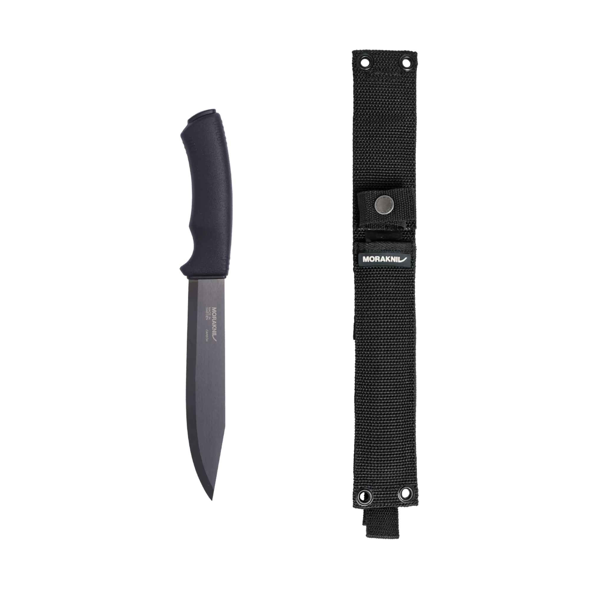Det ergonomiska skaftet av polymer har ett mjukt friktionsgrepp, fingerskydd och ett 3,2 mm tjockt blad av kolstål, som ger både styrka och stabilitet i varje skär. Den svarta DLC-beläggningen skyddar till viss del mot rost och förhindrar reflektioner i bladet. Tack vare blad- och skaftkonstruktionen blir kniven optimal för att kunna arbeta säkert och effektivt i olika väderförhållanden året runt. Knivslidan av slittålig nylon är symmetrisk, vilket innebär att den passar både höger- och vänsterhänta, har avancerade monteringsmöjligheter och är dessutom MOLLE-kompatibel. Kolstål rostar, torka av och olja in bladet efter användning.