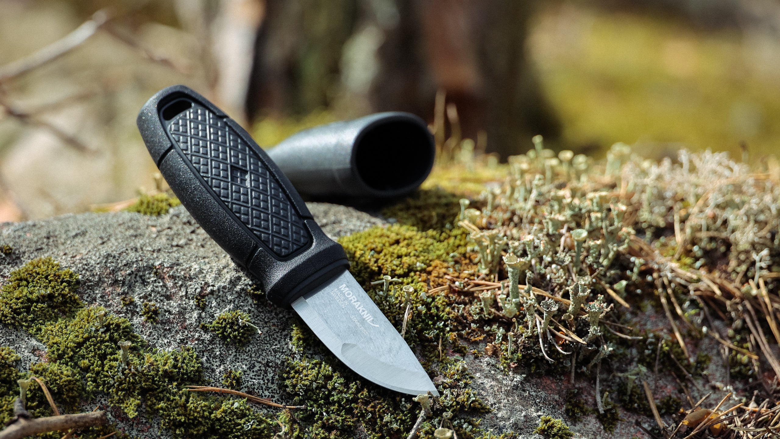 A black, durable plastic knife sheath for safe and practical storage of your Eldris knife. It is designed for both right- and left-handed users and features a secure click lock that keeps the knife in place even when turned upside down.