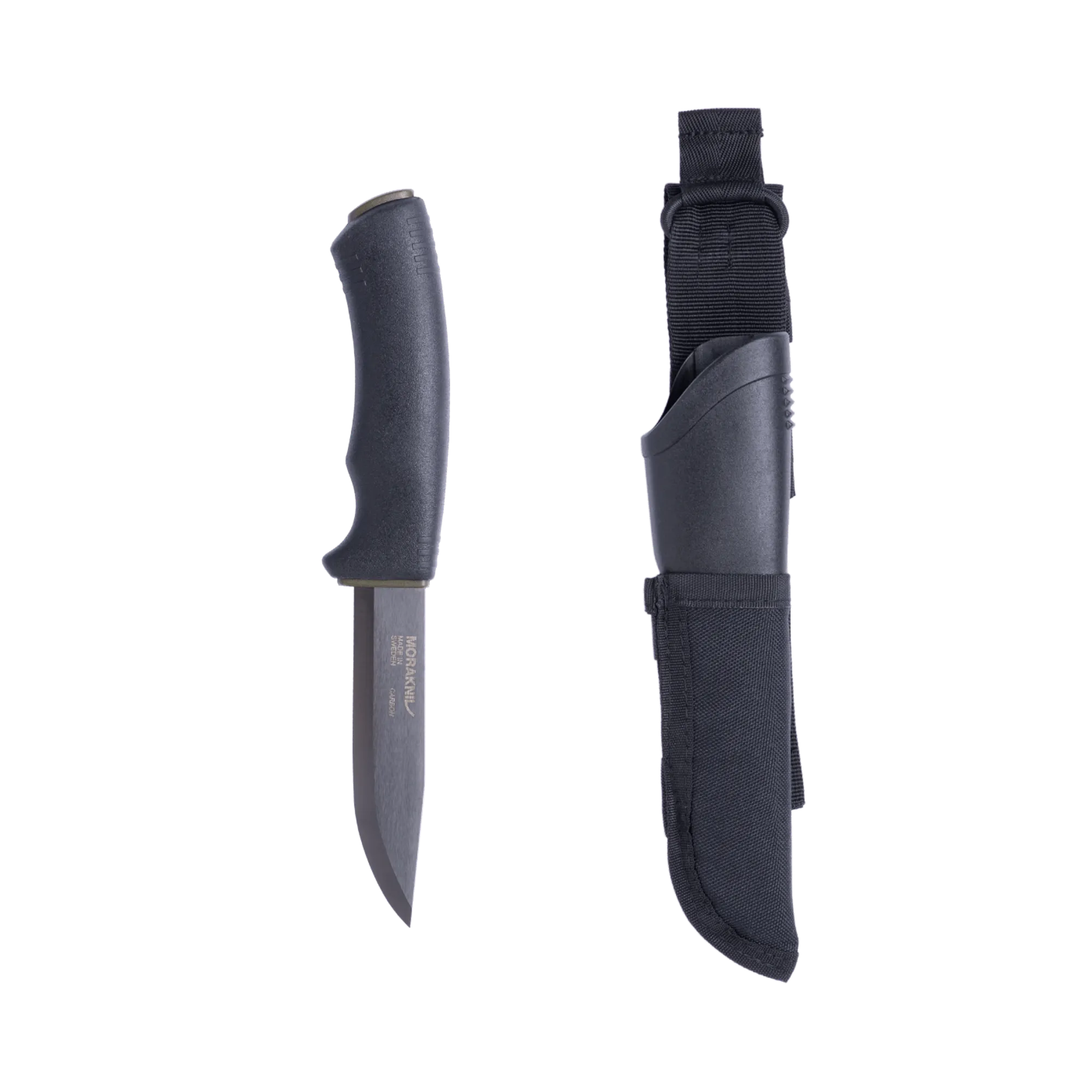 The ergonomic polymer handle has a soft friction grip, finger guard and a 3.2 mm thick carbon steel blade, providing both strength and stability in every cut. The black DLC-coating provides some protection against rust and prevents reflections on the blade. Thanks to the blade and handle design, the knife is ideal for working safely and efficiently in various weather conditions all year. The sheath made of polymer and durable nylon has advanced mounting options and is also MOLLE-compatible. Carbon steel rusts, so wipe and oil the blade after use.
