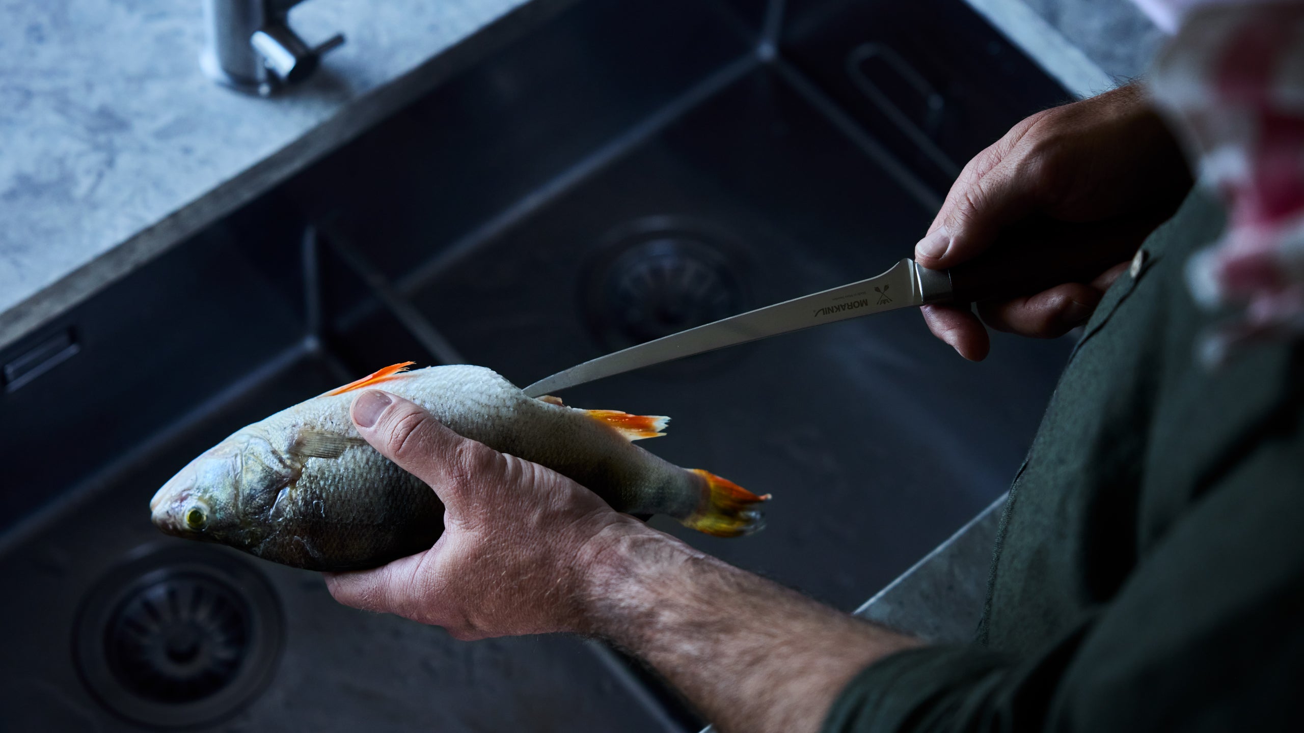 Filékniv Classic 1891 (S) är ett precisionsverktyg för att filéa fisk och trimma kött med exakta snitt. Det följsamma 18,8 cm bladet i svenskt rostfritt stål följer råvarans konturer, medan handtaget i rödbetsad björk ger ett balanserat grepp för full kontroll.